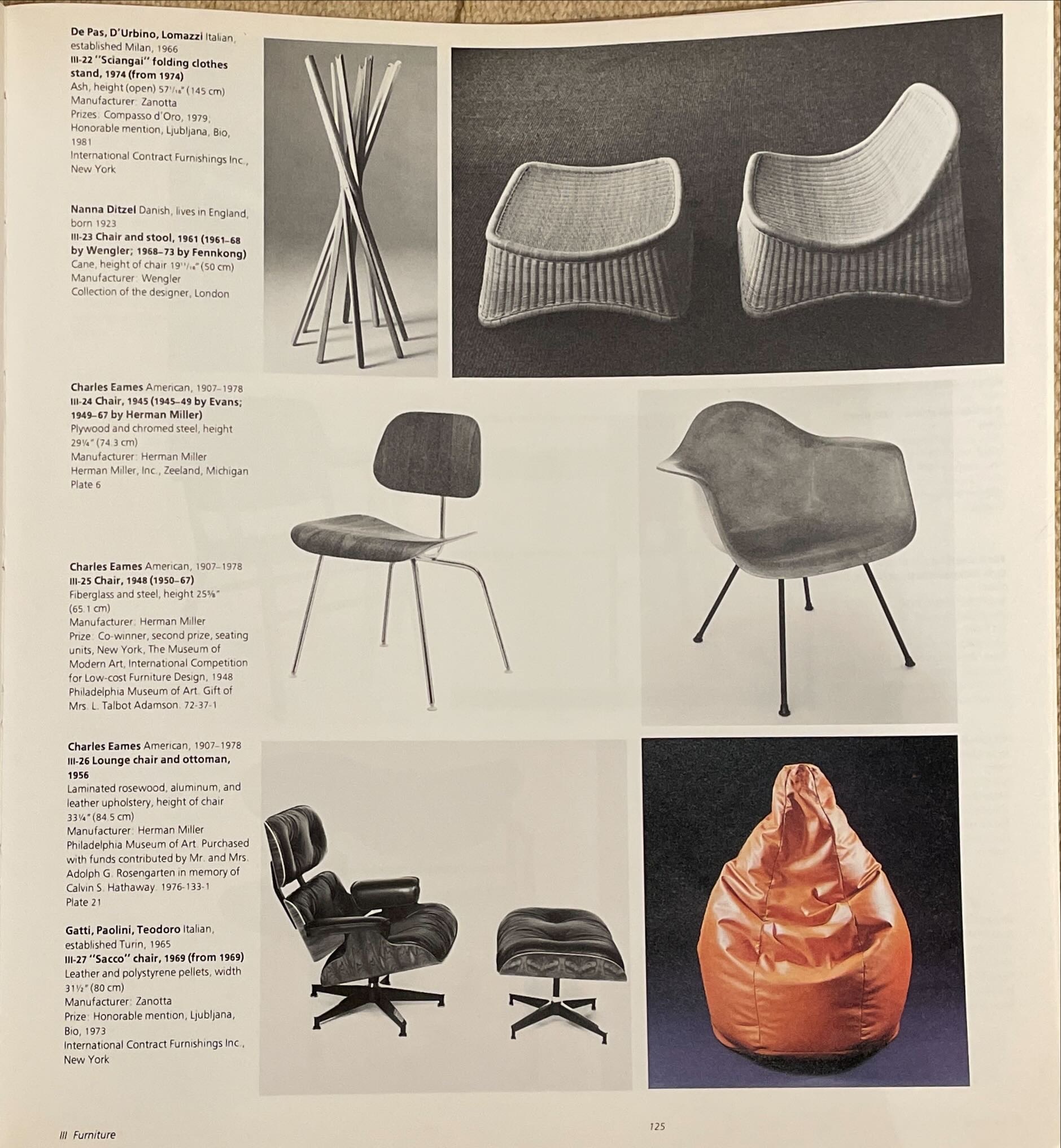 我特別想到的是Charles Eames的1945年鋼腿餐椅DCM(III-24)、1956年的躺椅Lounge Chair(III-26)以及他和Eero Saarinen的玻璃纖維椅DAX和Organic Chair (III-25,79)。我還想到了Harry Bertoia1952年(III-9)的鑽石椅,以及每個年輕設計師在一個生產過程中創造椅子的夢想,例如Verner Panton在1960年(III-61)的玻璃纖維椅Panton Chair。很自然,每個新設計似乎都會讓材料或生產方式發生巨大的進步。