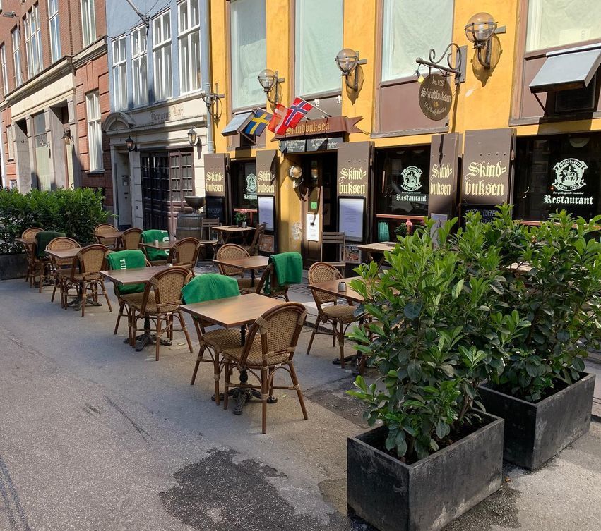 鄰近國王新廣場 Kongens Nytorv的Skindbuksen餐廳是哥本哈根歷史最悠久的餐廳之一,據說成立於1728年已有近三百年的歷史,房舍建築於1767年,Skindbuksen是舊時是許多載主人到丹麥皇家劇院的馬車司機休息用餐的地方,提供簡單便宜的食物,店名有可能是因為馬車司機常穿著耐磨的皮褲所以取名Skindbuksen(皮褲)。