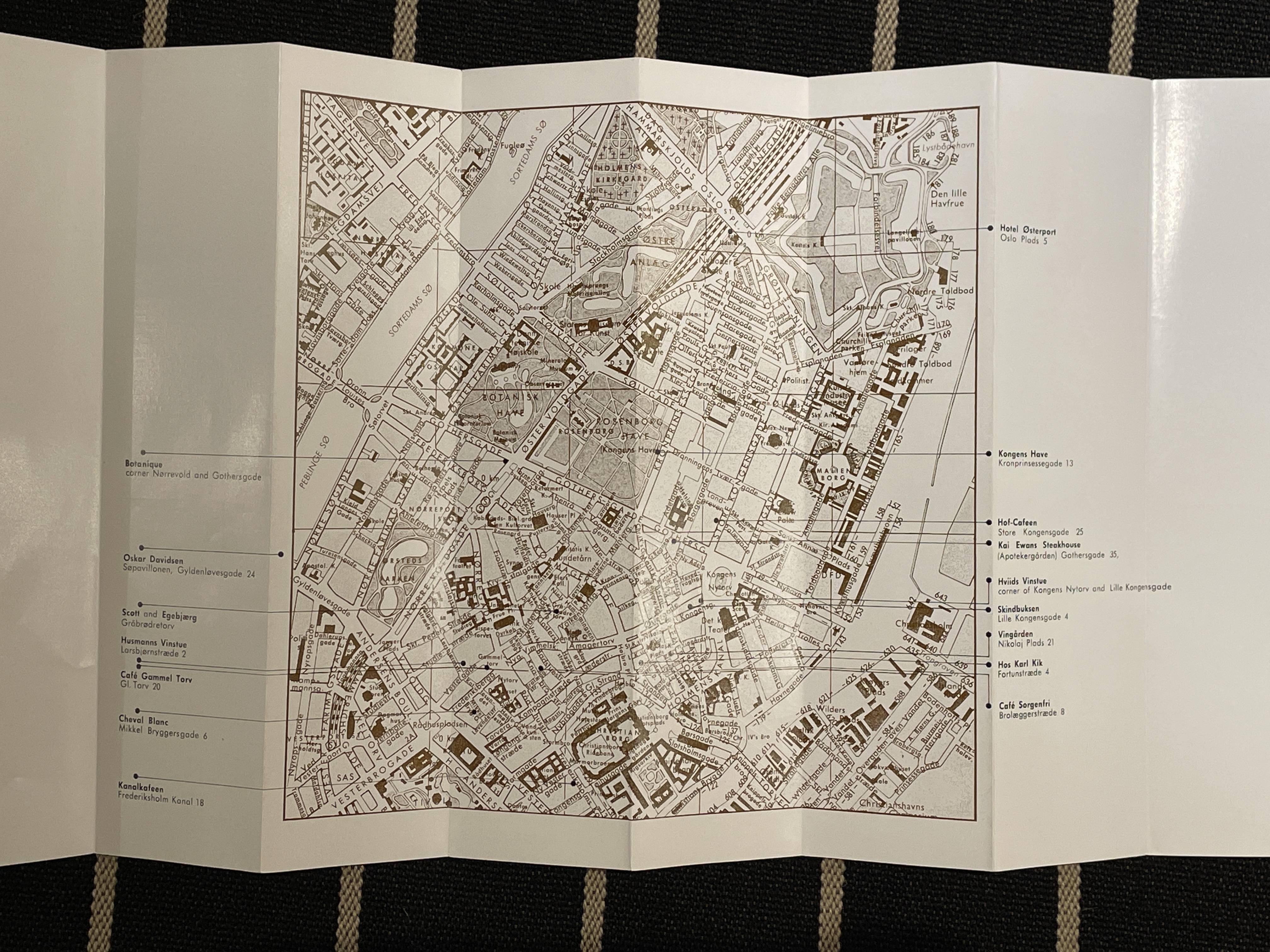 在1973年的丹麥雜誌Mobilia中發現一份摺頁-Lunch with mobilia,"許多到丹麥的遊客常問我們到哥本哈根要吃什麼呢 ? 因為北歐家具展將在五月舉辦,所以我們製作了這個摺頁,挑選了10間值得推薦的餐廳。"
