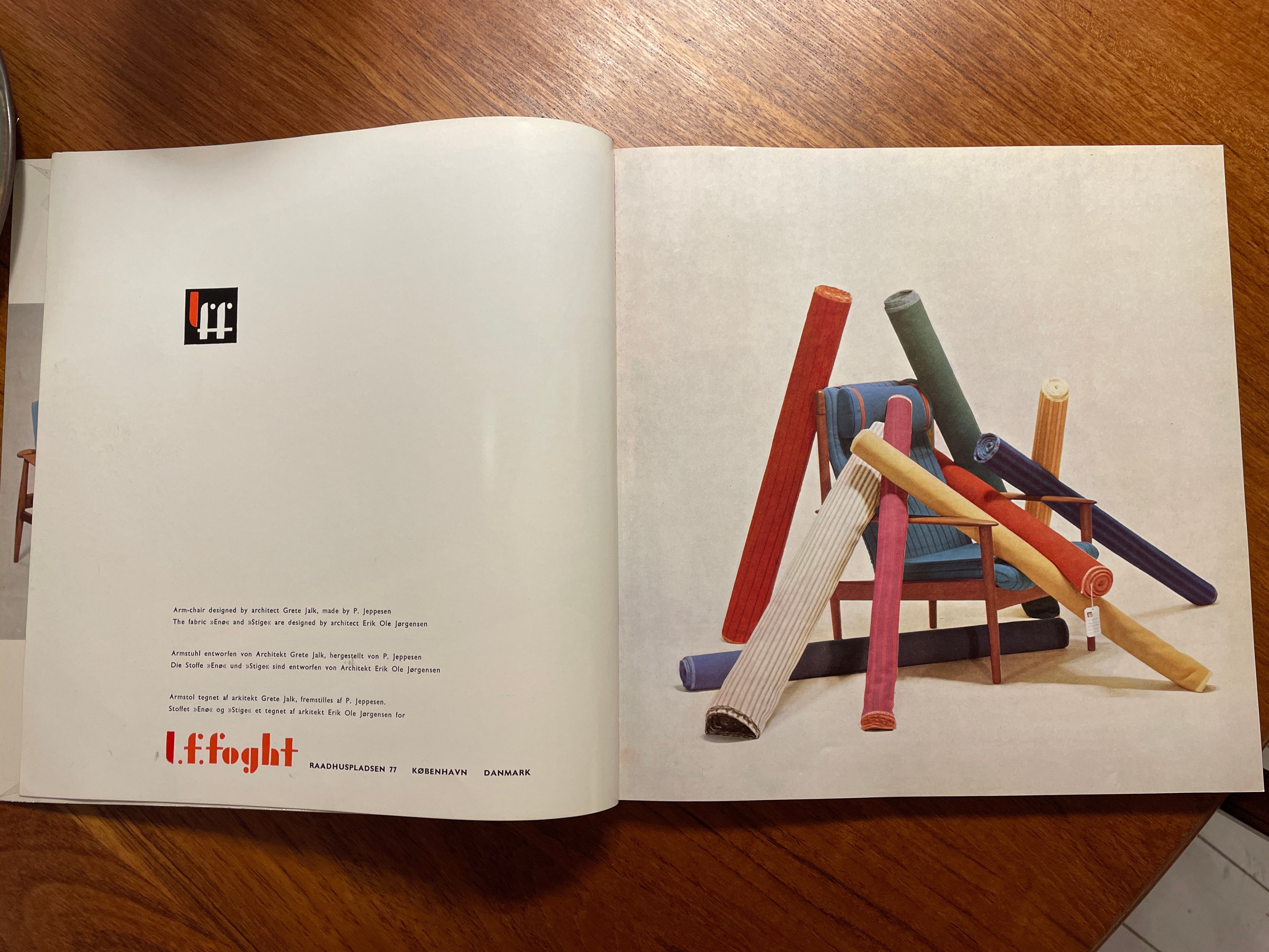 接續的廣告是織品商l.f.foght 以Grete Jalk的56號扶手椅為基底,介紹該廠委由Erik Oler Jørgensen設計的布料,同樣也是用了兩頁彩色頁以凸顯織品特色。