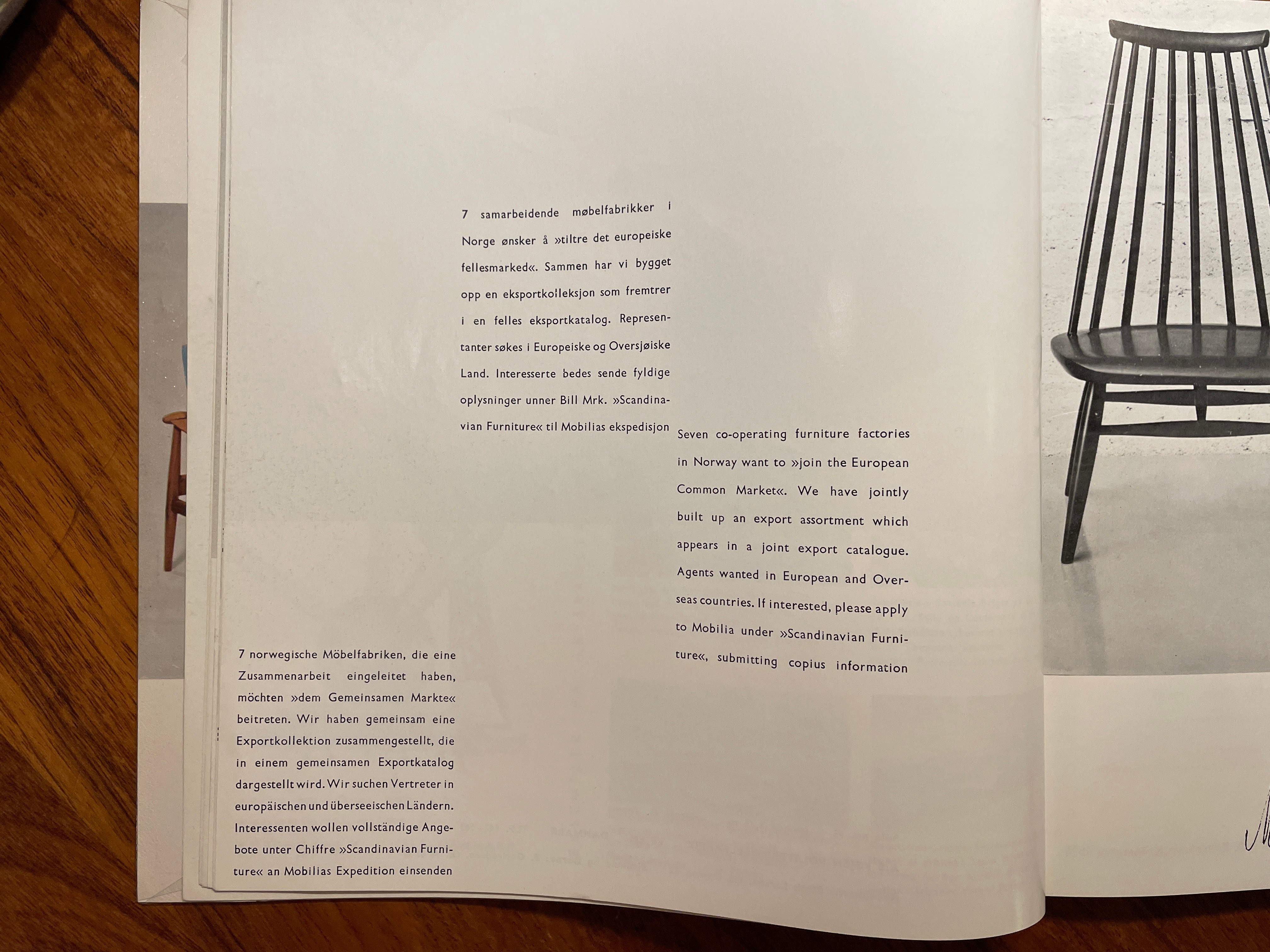 比較特別的是有一頁由七家挪威家具廠聯袂刊登的廣告,希望有興趣將他們產品銷往歐洲共同市場的人,可以與mobilia聯絡,再次印證了丹麥確實為北歐面向歐洲的窗口。