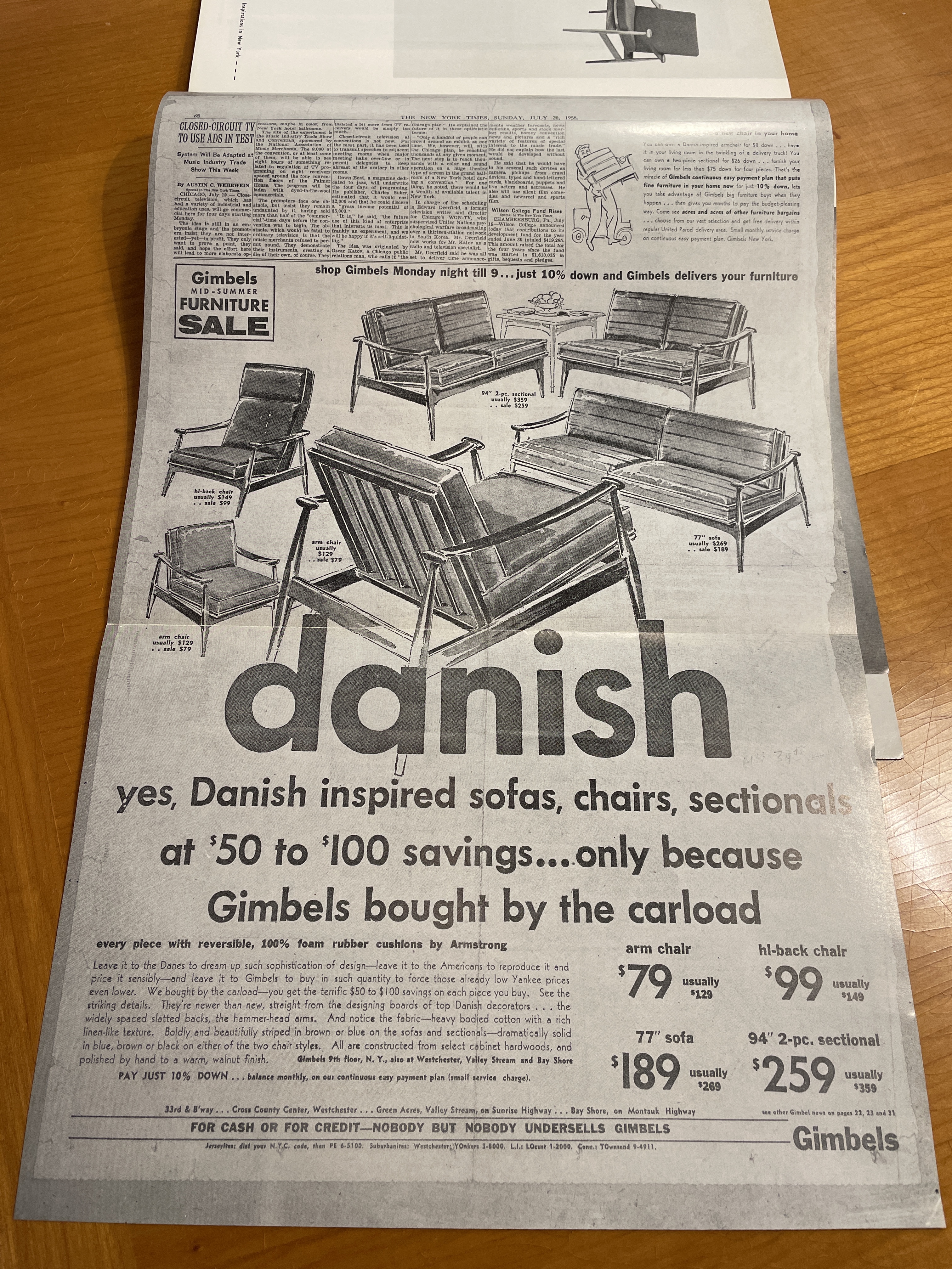 在1958年的7月20日的報紙The New York Times有一幅幾乎全版廣告,廣告中的家具乍看之下是由Finn Juhl在1955年設計France & søn生產的fd133,中間還有幾個大字danish,讓人以為是France & søn在美國刊登的廣告。