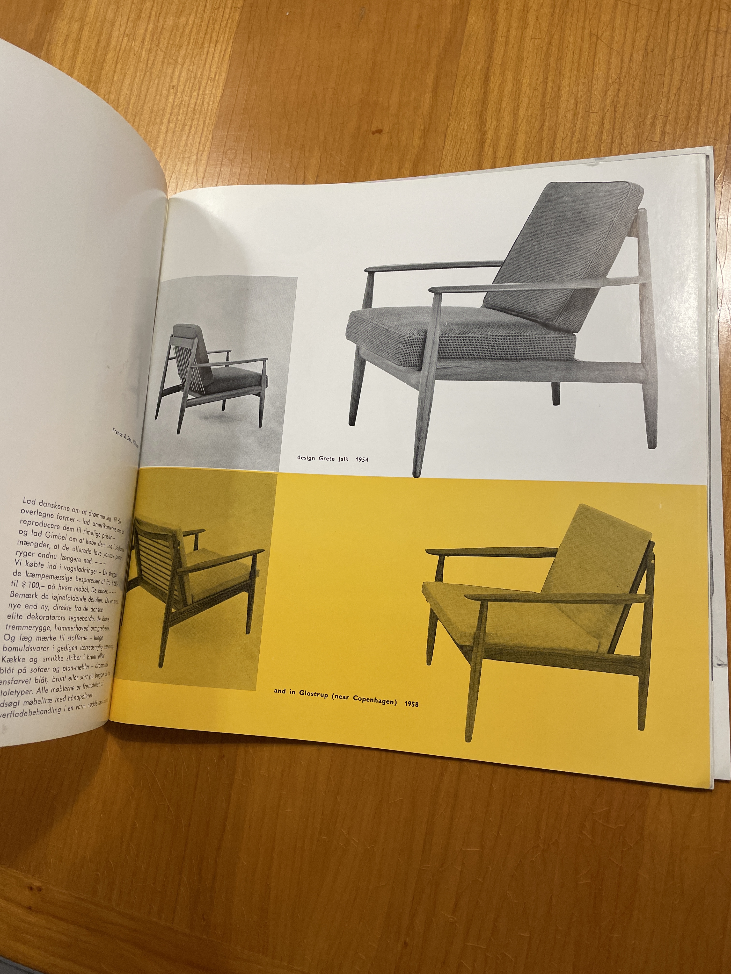 文章的最後一頁是上下兩組很類似的家具照片,上半是Grete Jalk 1954年為France & søn設計的fd118,下半是哥本哈根附近的城市Glostrup製作的仿品。