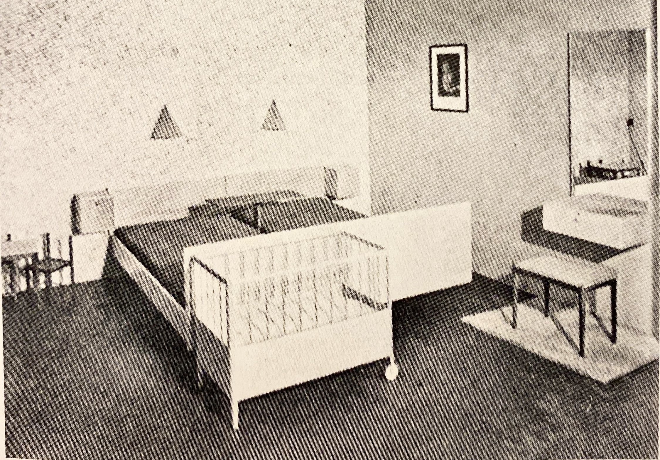 Bedroom with nursery furniture, executed in maple and mahogany.