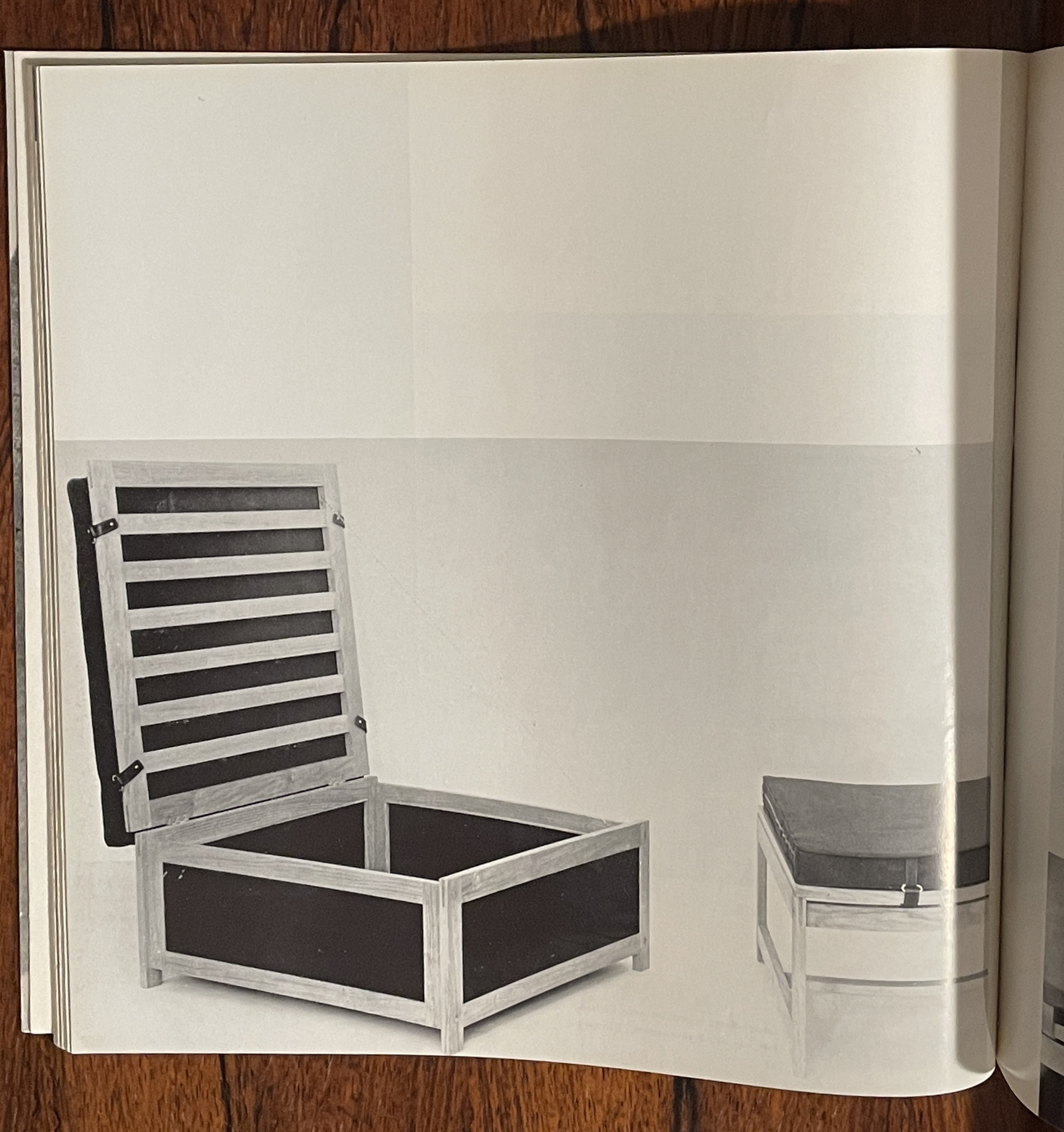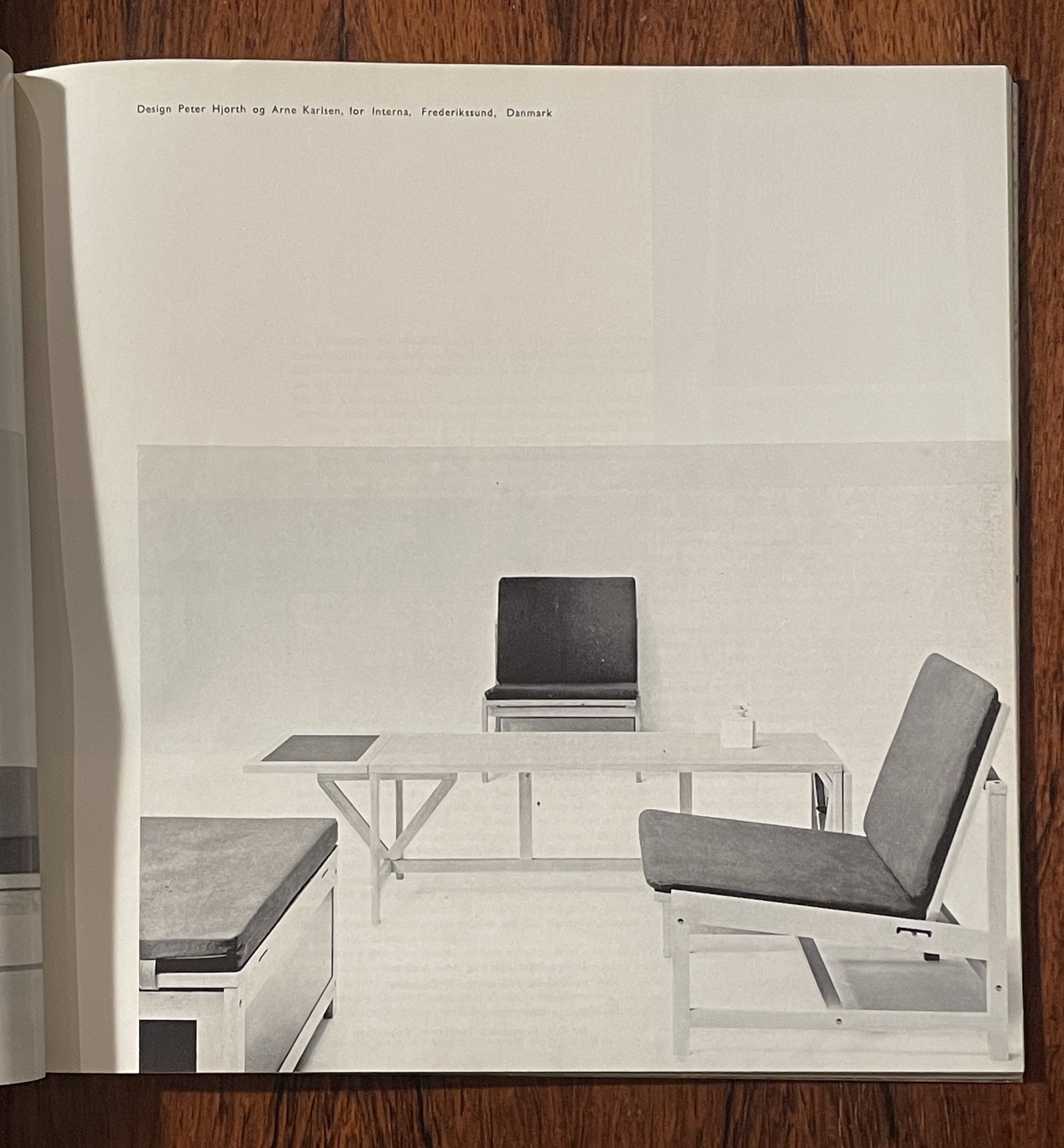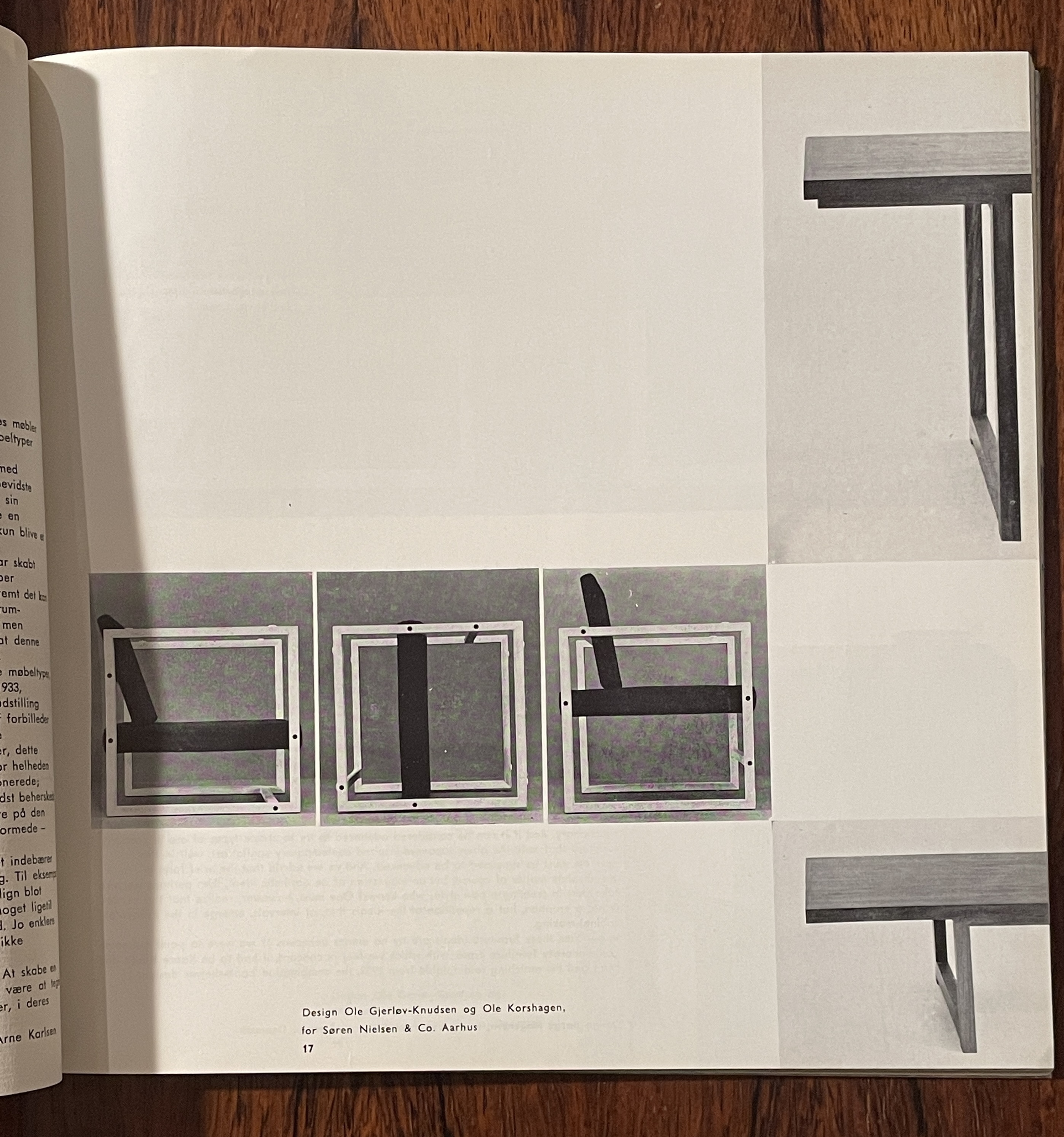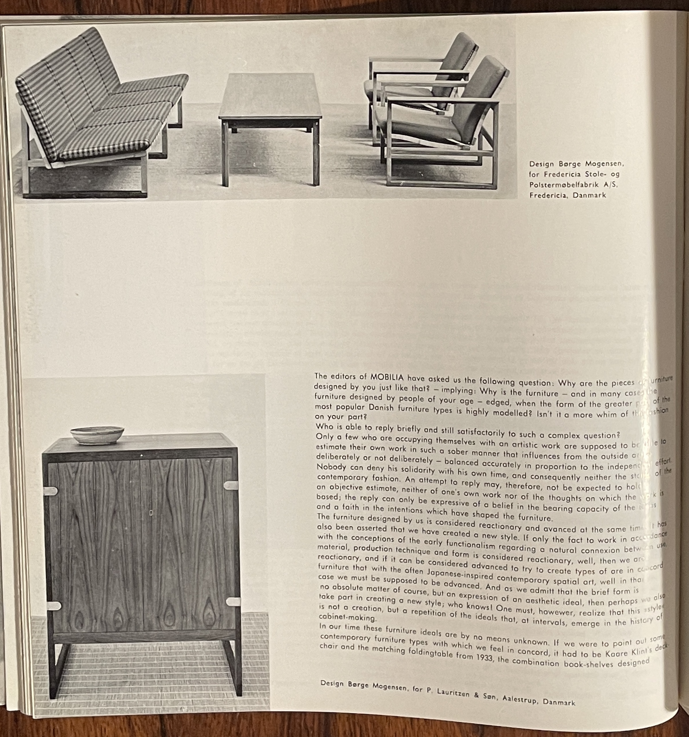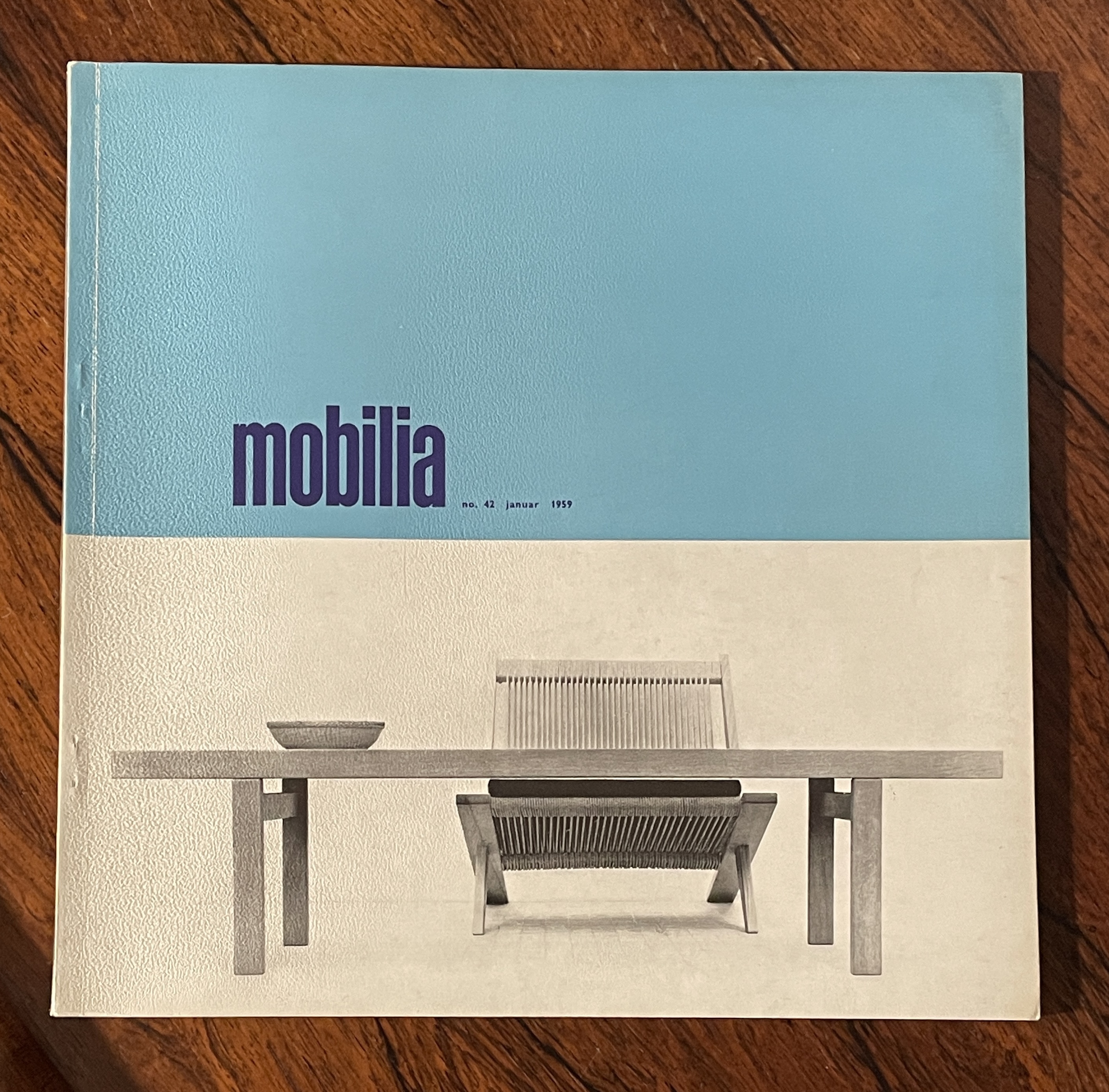 1959年1月第四十二期的mobilia雜誌封面有兩個主要的元素,它們各佔了畫面的一半。在上半部,Tiffany藍的底色襯托出左側深藍色的較大mobilia字樣,接續著期數與發行年月的小字;封面的下半部是Jorgen Hoj 和Poul Kjaerholm設計的兩件作品,長桌橫亙左右,將畫面再次分為均等的上下兩半,旗繩椅面的休閒椅座落在畫面中央偏右,與長桌的左側的淺藤盤呈均衡之勢。