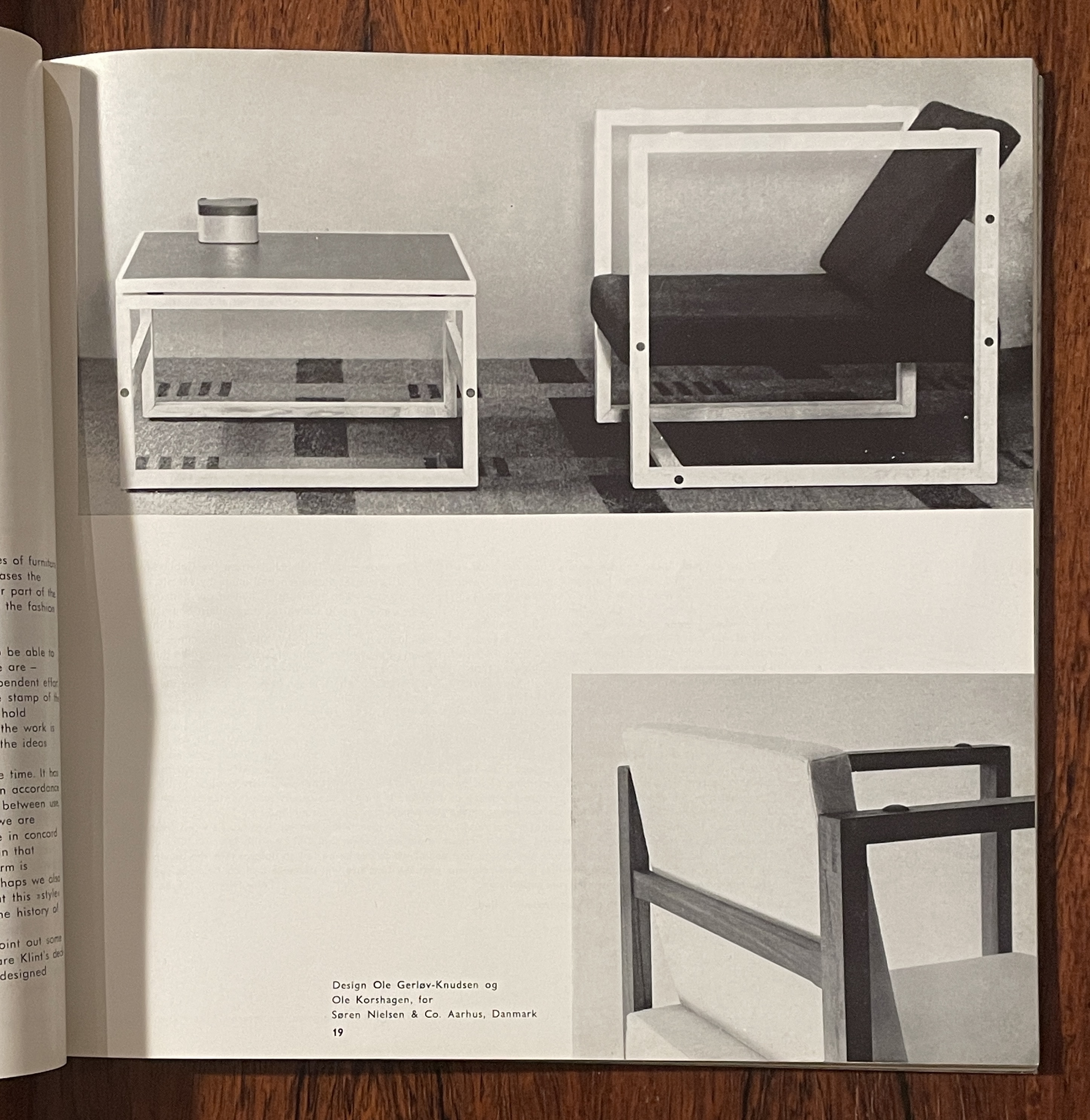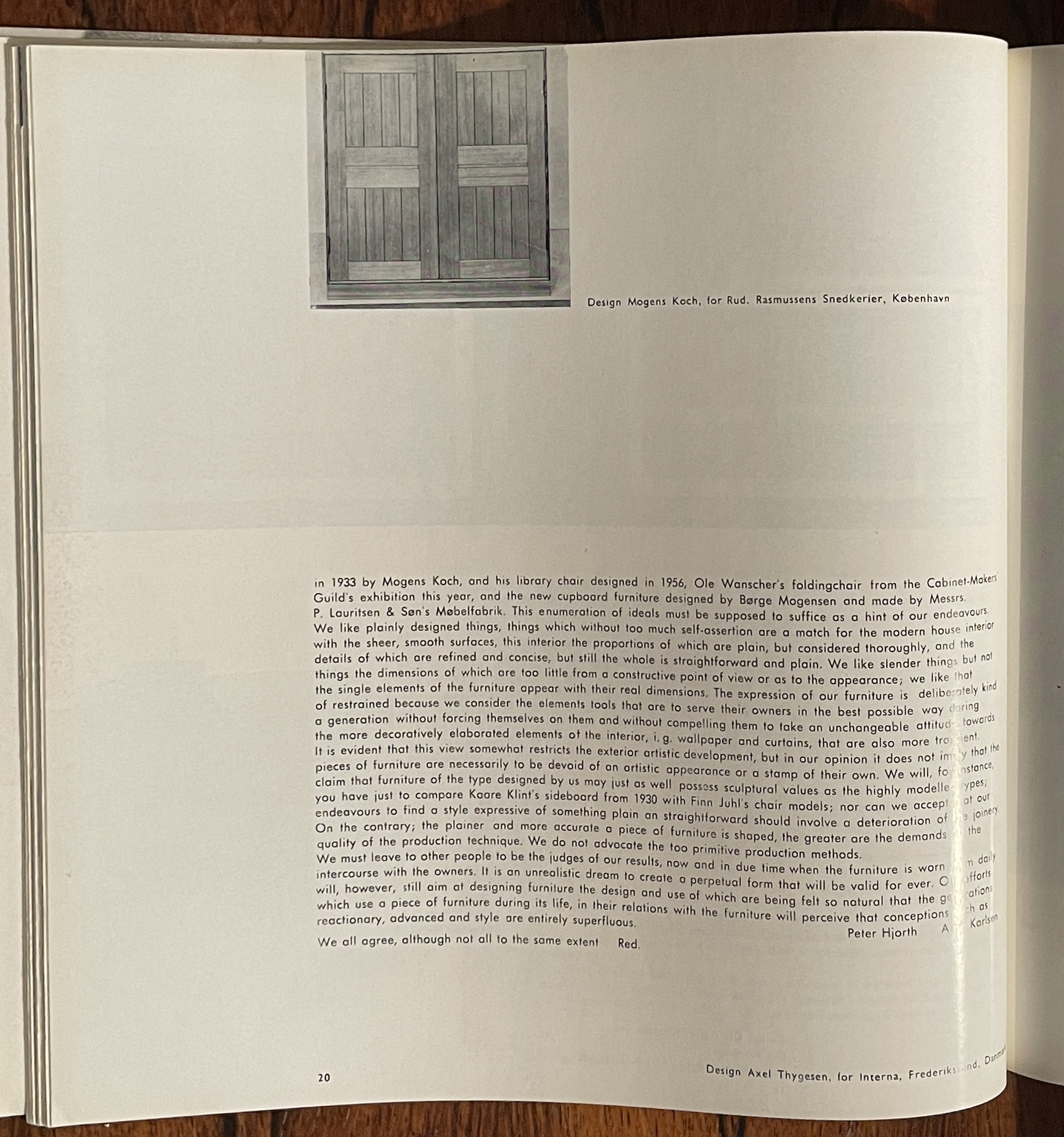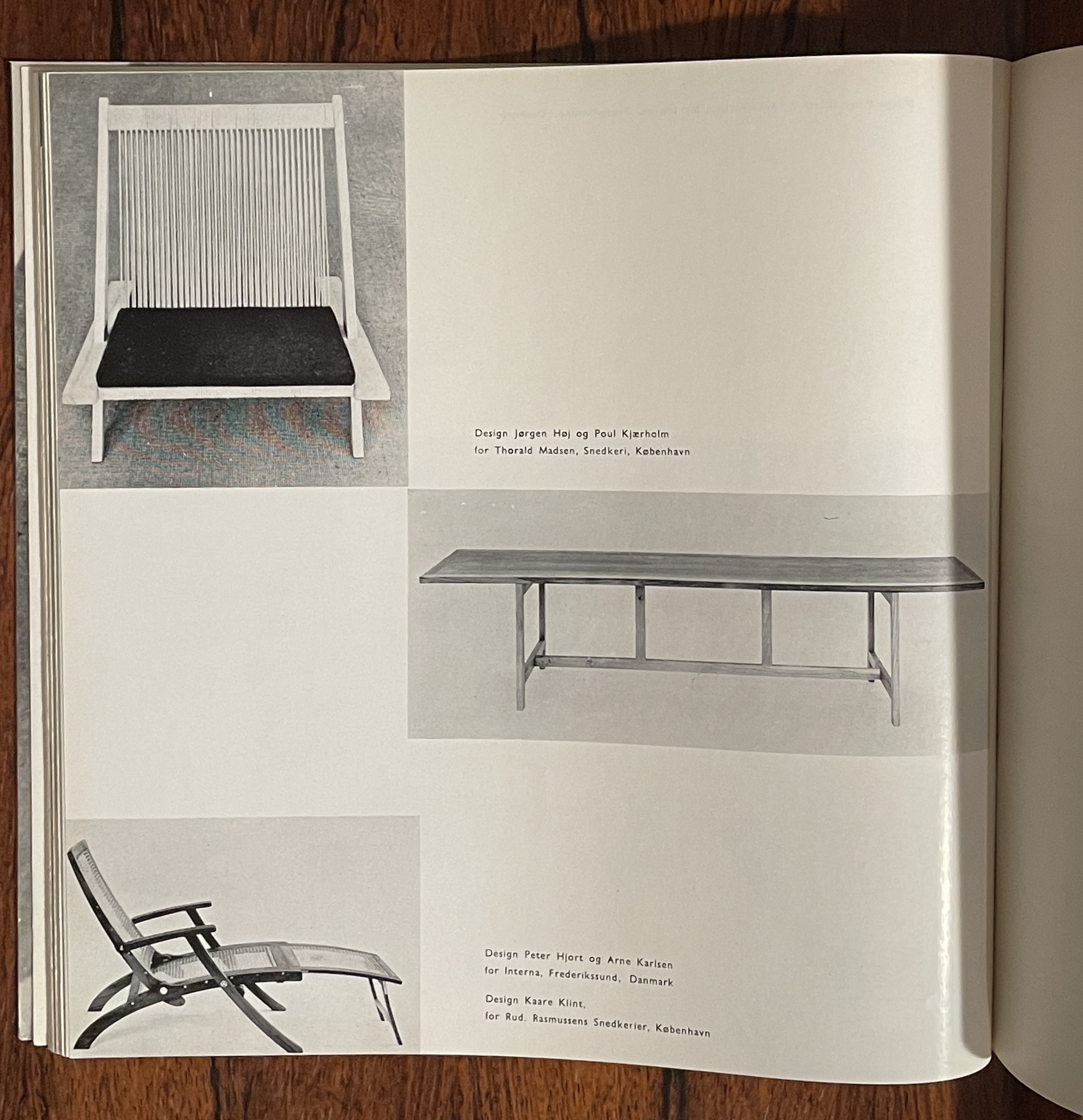他們接著指出Kaare Klint的1933年躺椅和配套折疊桌,Mogens Koch設計的1933年組合書架和1956年的圖書館椅,Ole Wanscher在今年工匠協會展覽的折疊椅,以及Borge Mogensen設計由P. Lauritsen & Son’s Mobelfabrik製造的新櫥櫃家具,都讓他們感到有共鳴。