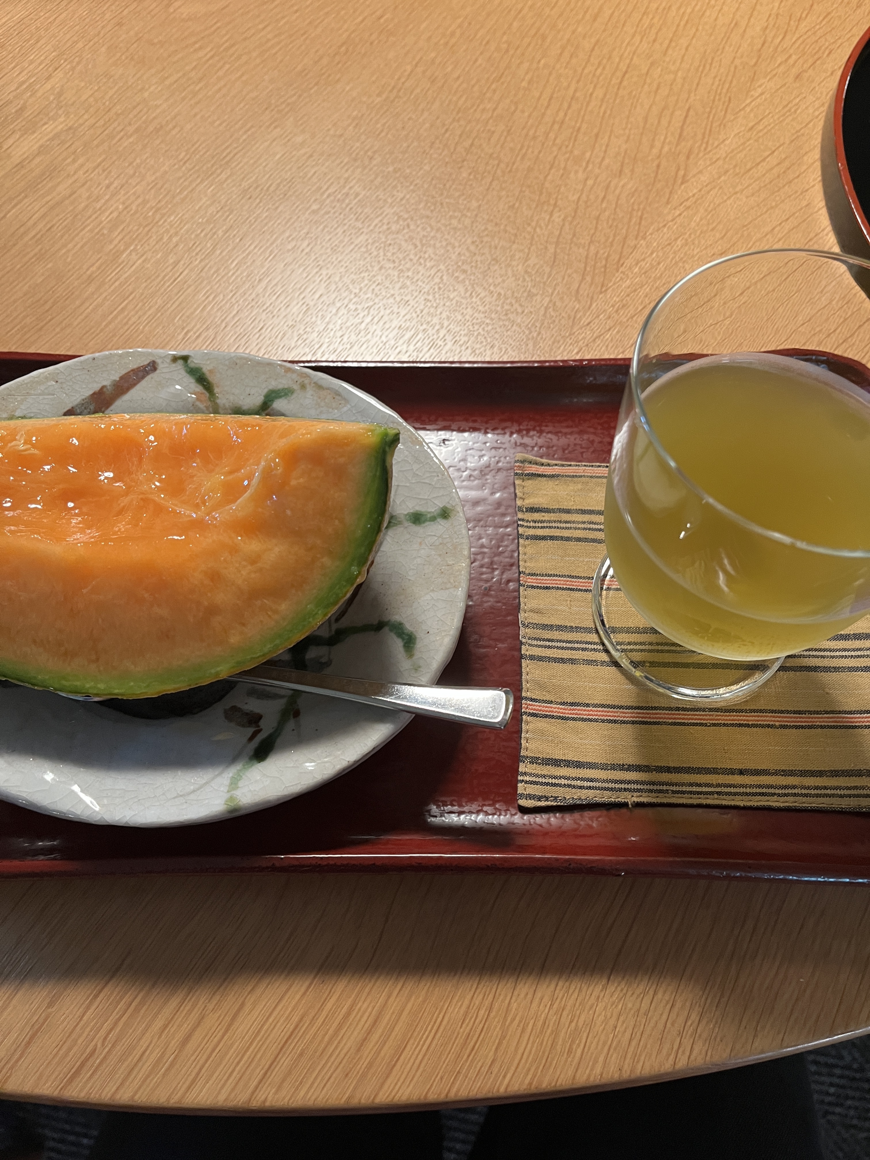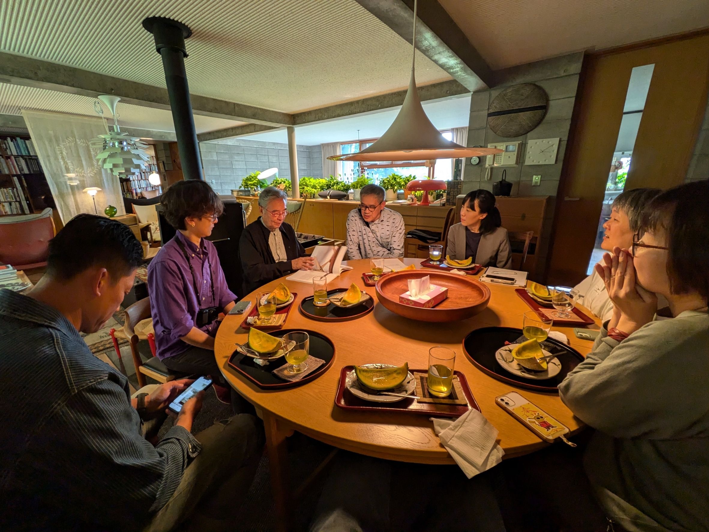 回到起居室,教授指引大家來到Børge Mogensen的圓桌旁邊,並讓我們從旁搬了幾張椅子過來坐下,面對這些名作,每個人無不小心翼翼的搬動它們。坐定之後,織田夫人從廚房陸續端出了一盤一盤的哈密瓜與茶水,眼前這碩大的哈密瓜看起來就讓人垂涎欲滴!織田教授說這是難得的夕張哈密瓜,並告訴大家它的難得之處。我們在德布西的月光樂聲中,一口一口品嚐著這柔而不糯、甜而不膩的珍饈,真是一個奇妙的時刻!