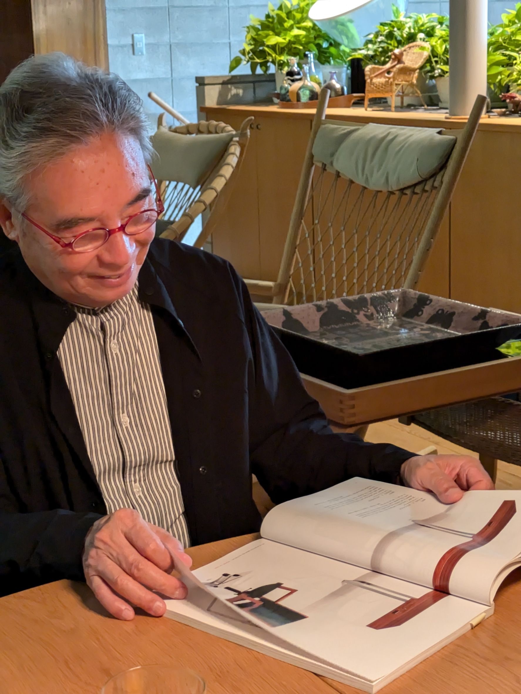 說著說著,聊到教授正在Centpure(東川町複合交流施設)的展覽-The ABC of Chairs中,其中有兩張Hans Wegner的The Chair的Prototype,我們好奇的詢問取得的過程?他起身去拿了一本2014年Bruun Rasmussen的拍賣目錄Wegner 100 years,當期拍賣有許多Wegner重要的作品,而教授也在這場拍賣取得了數件佳作,包含這兩張The Chair的Prototyp。翻閱過程中教授也和我們有著一樣的感慨,10年前的價格和今日真是不可同日而語。