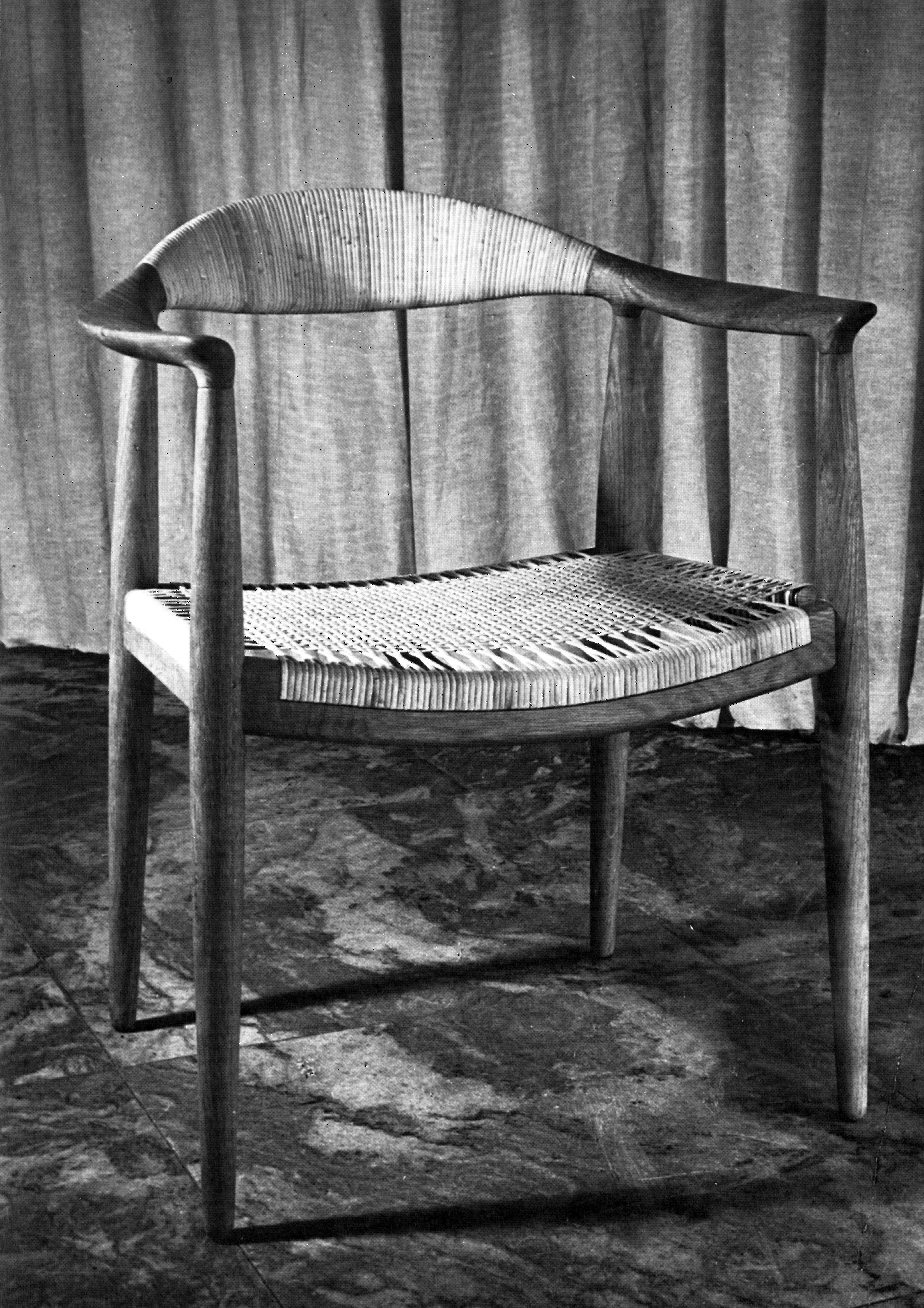我們找出他所設計第一把椅子的照片,這個草圖設計於1937年,次年這把椅子參加了一年一度的家具匠師公會展,這個展覽活動持續了將近半世紀,對於丹麥設計有著重要的意義。丹麥各類型的工藝在50年代,跟著丹麥家具所創造的成功浪潮一起興盛,其背後就歸功於各種媒材的工匠們,在他們簡陋的工坊車間裡進行 "實驗室工作" 。這第一把椅子完整展現了韋格納的特色 — 近乎完美的功能、具雕塑感的外觀和奔放的扶手。